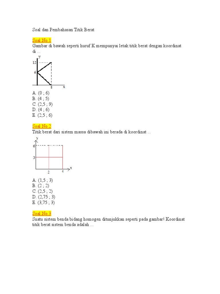 Serta titik d berada pada koordinat (6,4) ditulis dengan d(6,4). Untuk lebih jelasnya perhatikan contoh soal menentukan letak titik berat dan pembahasannya dibawah ini. 1 tentukan koordinat titik berat susunan enam buah kawat tipis berikut ini dengan acuan titik 0 ! Pembahasan nomor 2 perhatikan gambar bidang homogen di samping. Tentukan koordinat titik berat karton tersebut.